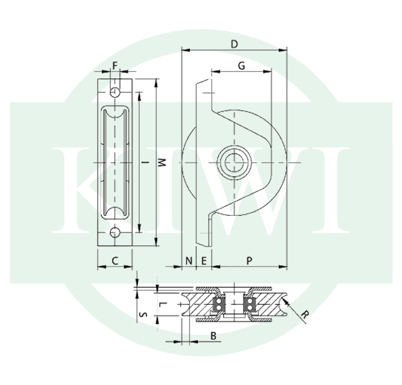 Article No. | B (mm) | C (mm) | D (mm) | E (mm) | F (mm) | G (mm) | I (mm) | L (mm) | M (mm) | N (mm) | P (mm) | R (mm) | S (mm) | Load (KG)** |